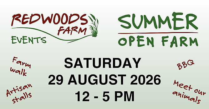 Our festival vibe returns this year at our Summer Open Farm event on Saturday 29 August 2026, 12pm - 5pm. We'll be firing up the BBQ, along with talking about how we farm with nature, bringing you closer to our animals and the opportunity to browse our artisan stalls of local creators and makers. And of course our Redwoods produce will be available to purchase - regeneratively farmed, slow grown meat, eggs & honey for that Redwoods Flavour!