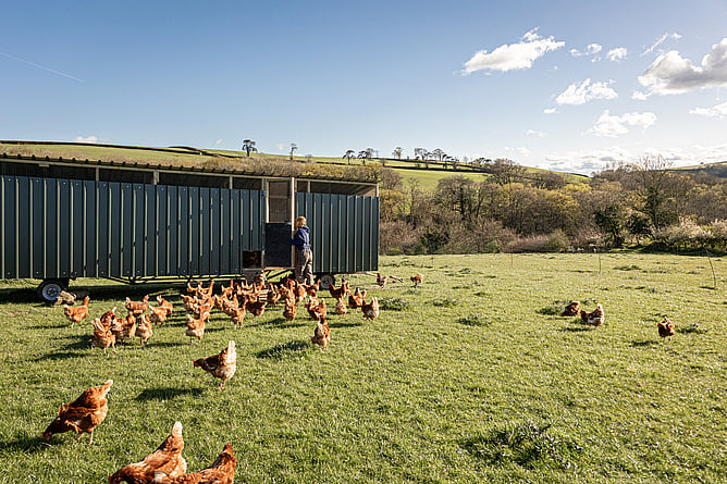 At Redwoods, we move our hens twice a week. They live in small flocks in converted trailers, an easily mobile system to take them all around the farm.